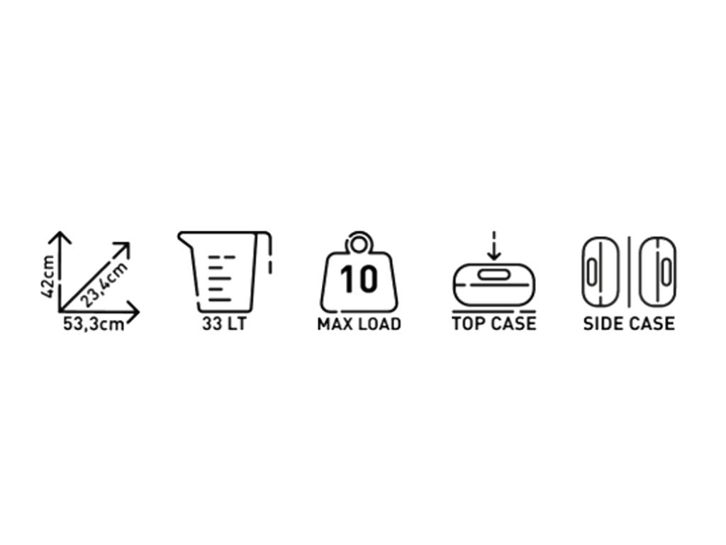 Кофр выпускается в двух вариантах. KGR33NN - полностью черный, KGR33 - черный с серебристой накладкой на крышке. Объем - 33 литра. Но есть и аналогичная 46-литровая модель KGR46. Разные объемы можно комбинировать. Например, по бокам вешать компактные, а сверху ставить объемный.