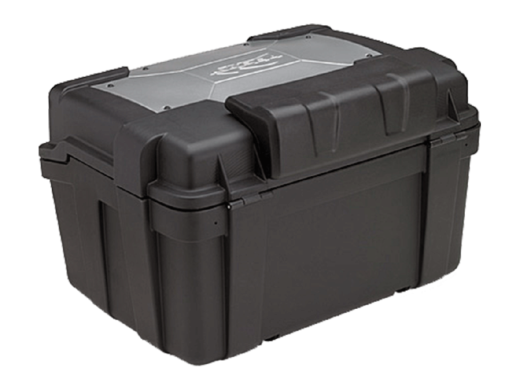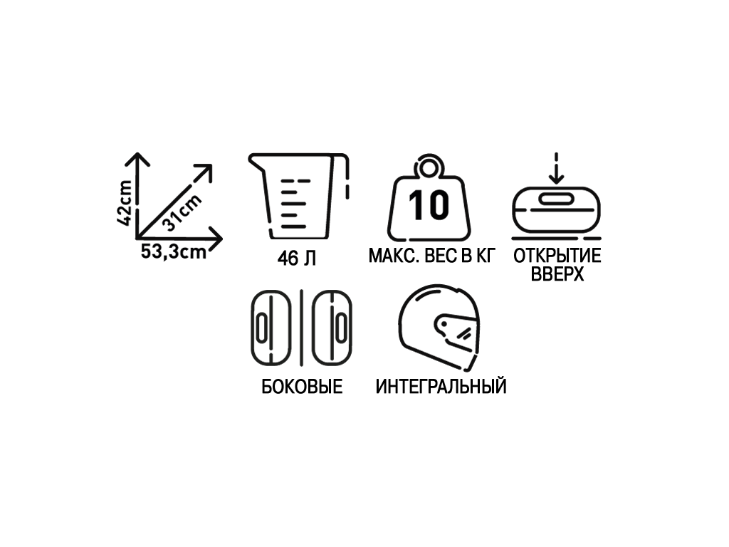 Кофр выпускается в двух вариантах. KGR46N - полностью черный, KGR46 - черный с серебристой накладкой на крышке. Объем - 46 литров. Но есть и аналогичная 33-литровая модель KGR33. Разные объемы можно комбинировать. Например, по бокам вешать компактные, а сверху ставить объемный.