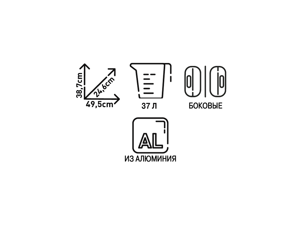 Помимо алюминия в конструкции используется нержавеющая сталь. Углы, профили и петли для ремней сделаны из технополимера. Объем - 37 литров. Если все вещи не поместились в кофр, на крышке есть петли, чтобы привязать их сверху ремнями или сеткой. Для переноски предусмотрены прочные металлические ручки.