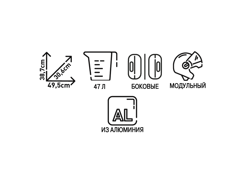 Помимо алюминия в конструкции используется нержавеющая сталь. Углы, профили и петли для ремней сделаны из технополимера. Объем - 48 литров. Если все вещи не поместились в кофр, на крышке есть петли, чтобы привязать их сверху ремнями или сеткой. Для переноски предусмотрены прочные металлические ручки.