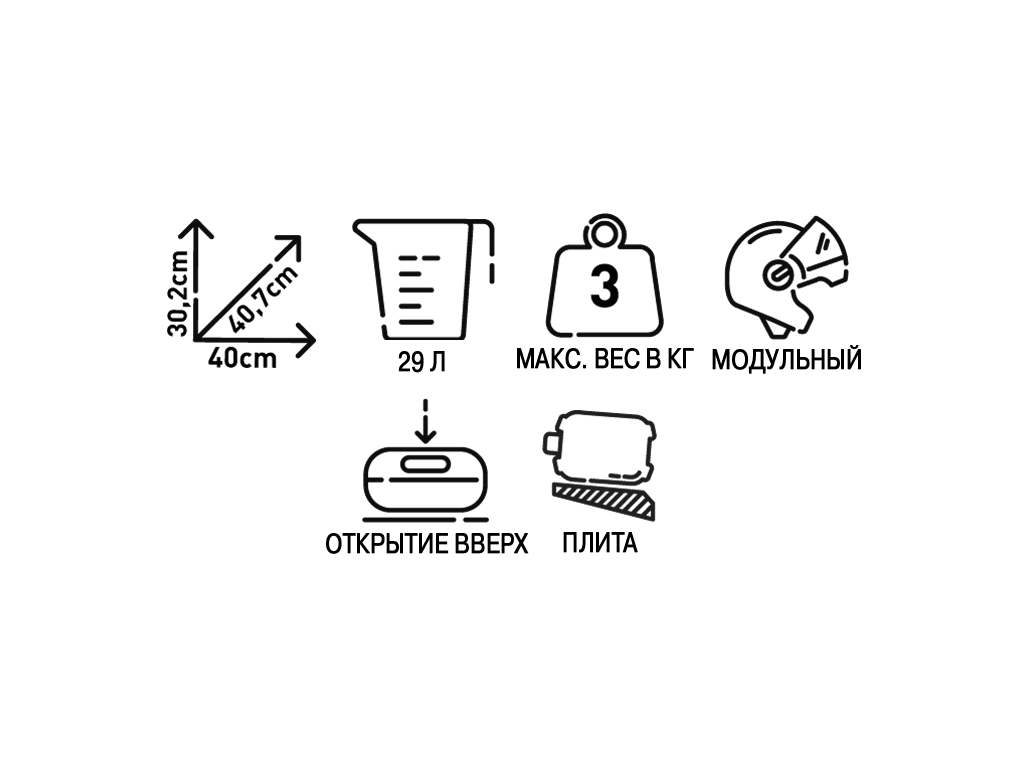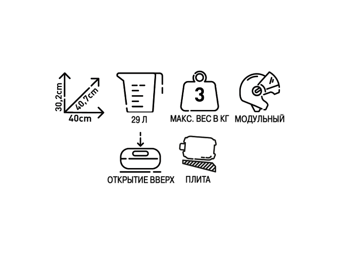 Корпус и крышка сделаны из полипропилена, отражатель - из поликарбоната. Кофр прошел тест на герметичность в специальной машине. Производитель гарантирует сухость внутри даже при сильном ливне мощностью до 20 литров воды в секунду. Крепление стандарта Monolock - удобное, надёжное и безопасное, рассчитано на мотоциклы лёгкой и средней кубатуры, а также скутеры. Для защиты от злоумышленников на замок закрываются как крышка, так и механизм крепления кофра к мотоциклу. В комплекте - универсальная площадка для установки на багажную решётку мотоцикла.