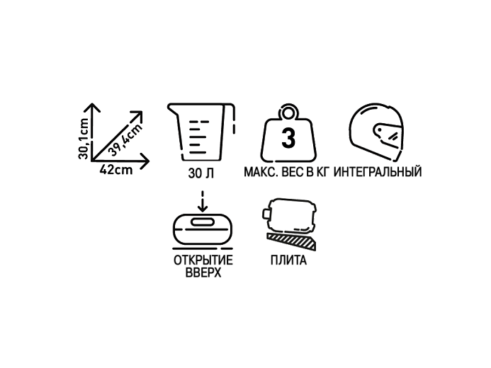 Кофр прошел тест на герметичность в специальной машине. Производитель гарантирует сухость внутри даже при сильном ливне мощностью до 20 литров воды в секунду. Крепление стандарта Monolock - удобное, надёжное и безопасное, рассчитано на мотоциклы лёгкой и средней кубатуры, а также скутеры. Для защиты от злоумышленников на замок закрываются как крышка, так и механизм крепления кофра к мотоциклу. В комплекте - универсальная площадка для установки на багажную решётку мотоцикла.