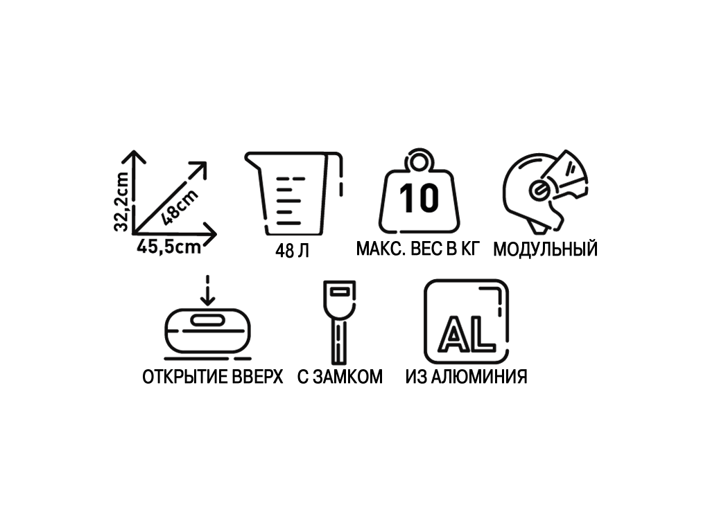Помимо алюминия в конструкции используется нержавеющая сталь. Углы, профили и петли для ремней сделаны из технополимера. 48 литров объема хватит для шлема-модуляр и еще останется место. Если все вещи не поместились в кофр, на крышке есть петли, чтобы привязать их сверху ремнями или сеткой. Для переноски предусмотрены прочные металлические ручки.