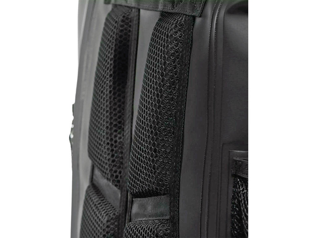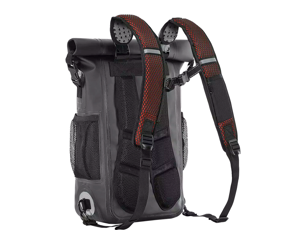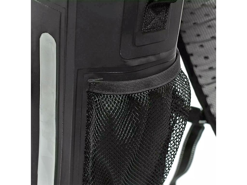 Материал - полностью водонепроницаемый ПВХ. Главное отделение закручивается, так что попадание воды исключено. Спинка мягкая, из сетчатой ткани, поэтому рюкзак удобно использовать и в жару.
