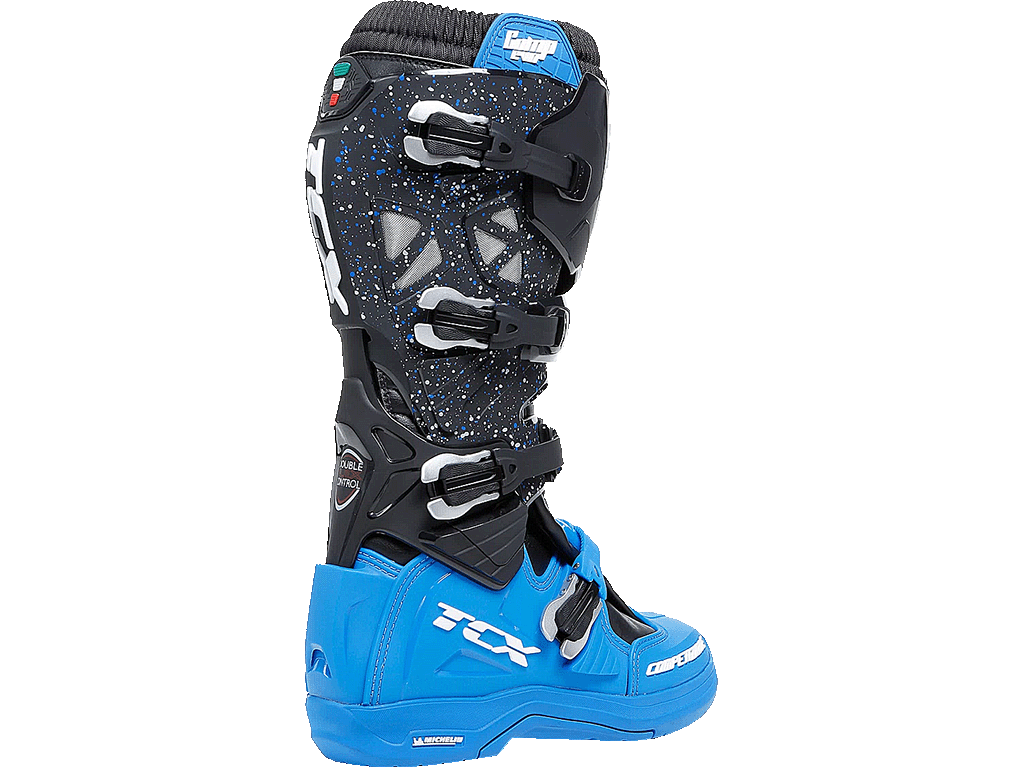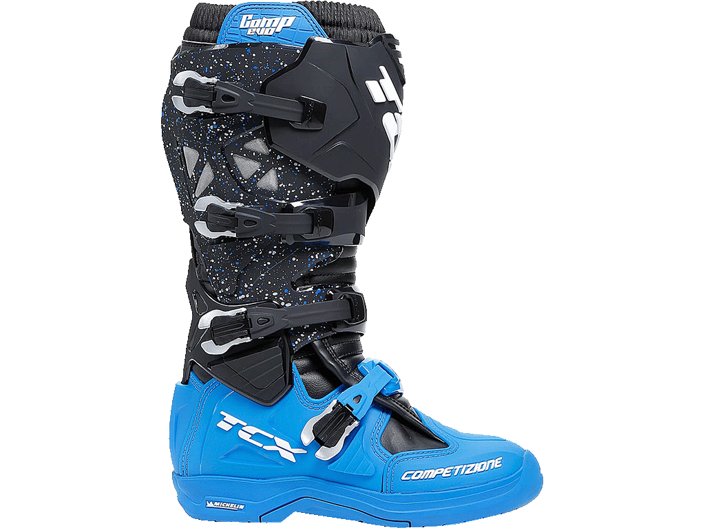 Ботинки для мотокросса и эндуро, с максимальной защитой, идеально поддерживающие лодыжку на каждом этапе катания, гарантируя оптимальный комфорт в течении длительных тренировок. Обувь Comp Evo 2 Michelin® отличается системой Double Flex Control — шарниром, расположенным в области лодыжки, который обеспечивает большую гибкость при, избегая риска нежелательного скручивания и перенапряжения. Защита имеется во всех стратегических точках, таких как голень, лодыжка, пятка и носок. Comp Evo 2 Michelin® включает в себя подошву Michelin® Hybrid MX со специально разработанным протектором и составом, обеспечивающим исключительное сцепление с подножками мотоцикла даже в неблагоприятных погодных условиях и на всех типах местности, включая самые экстремальные ситуации эндуро. Система крепления включает четыре полиуретановые и алюминиевые пряжки с микрометрической регулировкой. Внутренняя часть голенища оснащена панелями-липучками, поэтому посадку можно регулировать до миллиметра. Модель Comp Evo 2 Michelin® оснащена системой регулировки голени для дальнейшей адаптации посадки. Это позволяет установить переднюю пластину защиты голени в два разных положения. Подкладка из дышащей ткани и боковые вентиляционные отверстия сохраняют ноги сухими, обеспечивая максимальный комфорт.