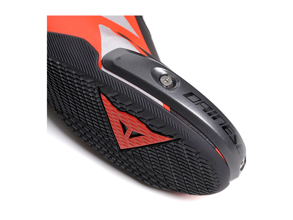Система крепления Suit To Boot Fastening System - эксклюзивный патент Dainese. Эта технология позволяет надевать ботинки под специальный костюм. Она была разработана для обеспечения наилучшего уровня безопасности, пи меньшем количестве деталей в экипировке. Технология также обеспечивает лучшую аэродинамику и комфорт благодаря уменьшению объема ботинок и усилению сцепления ноги пилота с мотоциклом.
