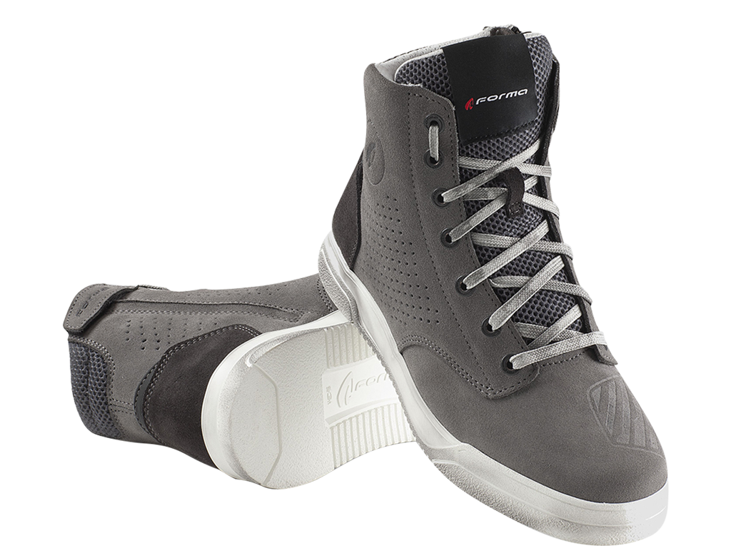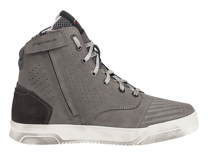 Forma City Flow - классические мотокроссовки с вентиляцией для городской езды и ходьбы в жаркую погоду. Стильные, мягкие, удобные, при этом с защитой. Подходящий вариант, чтобы приехать на мотоцикле на работу или на прогулку и потом весь день ходить, не переобуваясь. Серый цвет классно выглядит и подходит к самым разным мотоциклам. К тому же он не очень маркий. Шнуровка дополняет внешний вид, а заодно позволяет точно подогнать кроссовок по ноге. Для быстрого надевания и снятия сбоку есть молния.