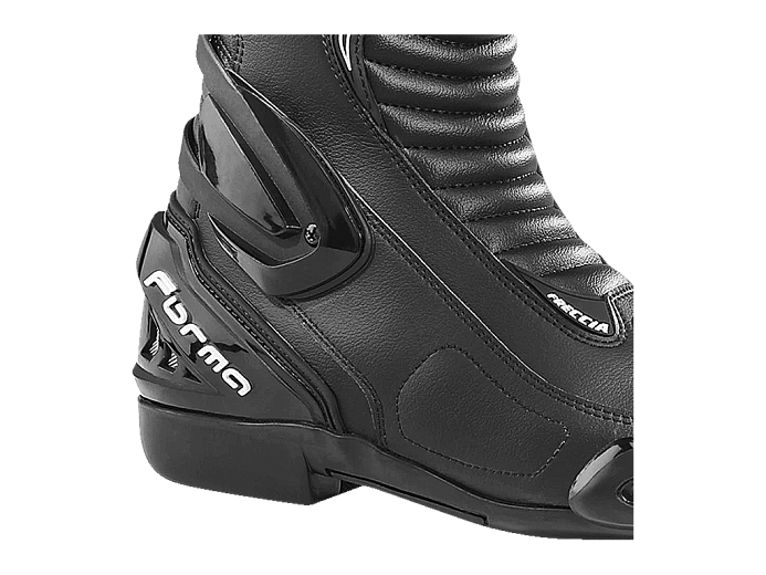 Мотоботы Forma Freccia - не только удобные, но и безопасные. Щитки из литого пластика защищают лодыжку, пятку, голень. На ребре стопы - сменный слайдер. Элемент пассивной безопасности - задние светоотражающие вставки. В зоне контакта с рычагом КПП установлена пластиковая накладка. Гоночная подошва двойной плотности обеспечивает хорошее сцепление с подножками, долго не изнашивается, смягчает удары и вибрации. Стельки обеспечивают циркуляцию воздуха внутри обуви и обдув стоп.