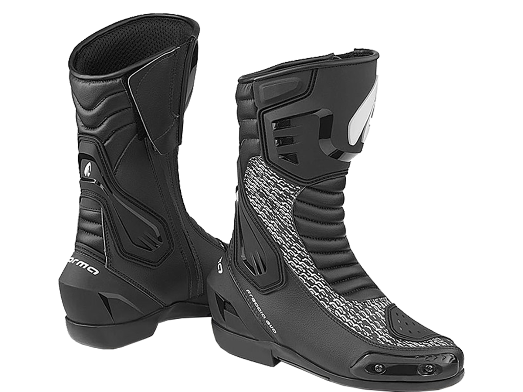 Forma Freccia EVO - дышащие мотоботы с высоким голенищем для спортивной и туристической езды. Агрессивный стиль сочетается с высоким уровнем комфорта и безопасности. Боты подходят не только для дорог, но и для трека. В верхней части - вставки из микрофибры. Мягкая полимерная подкладка с эффектом памяти принимает форму ноги и обеспечивает максимальный комфорт. Двойная система застежки с “молнией” и “липучкой” плотно фиксирует мотоботы на ноге.