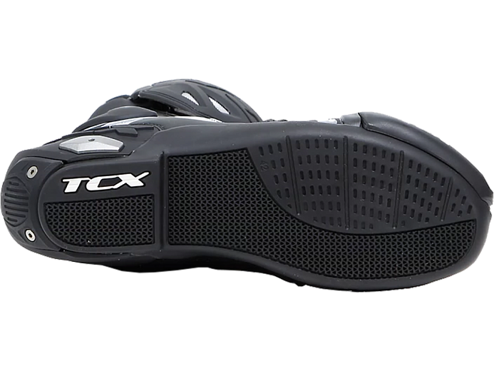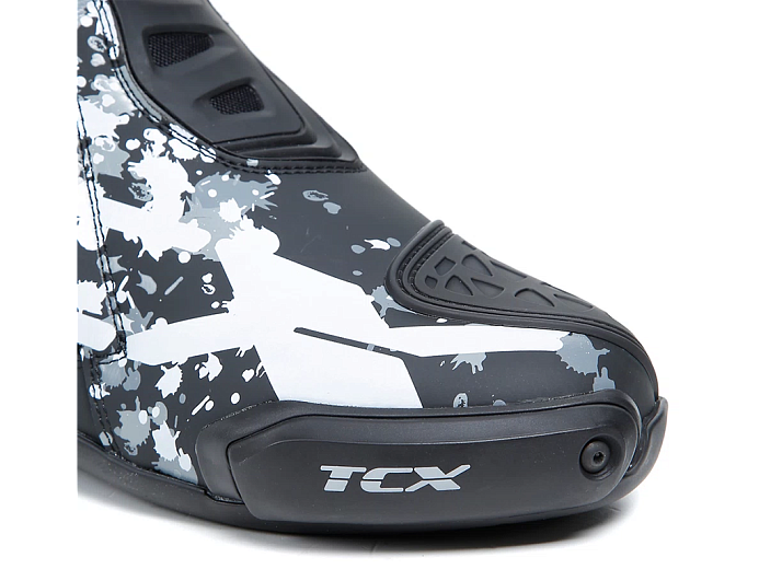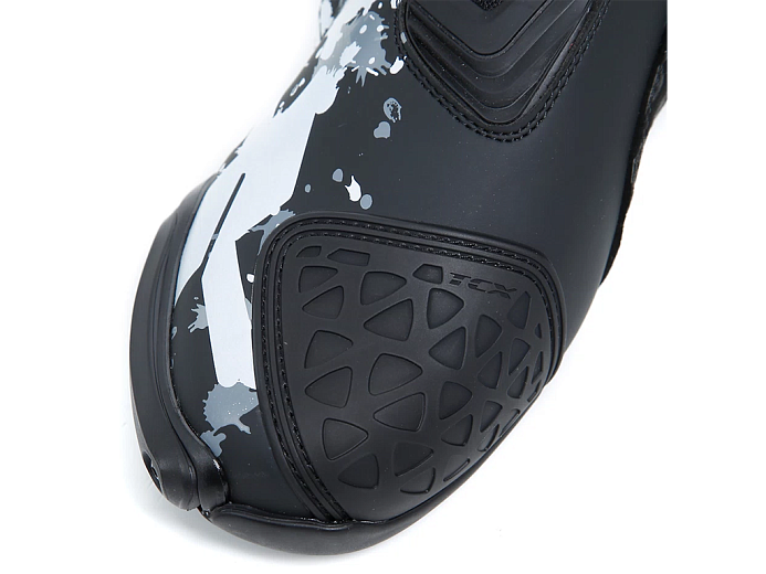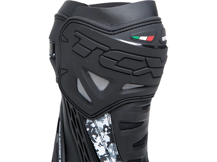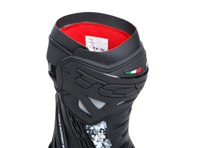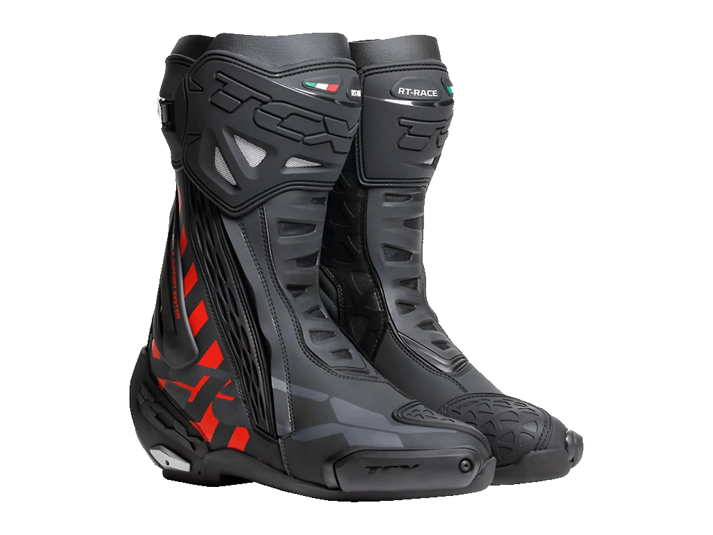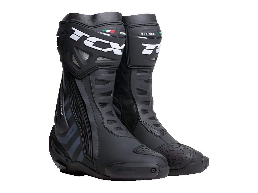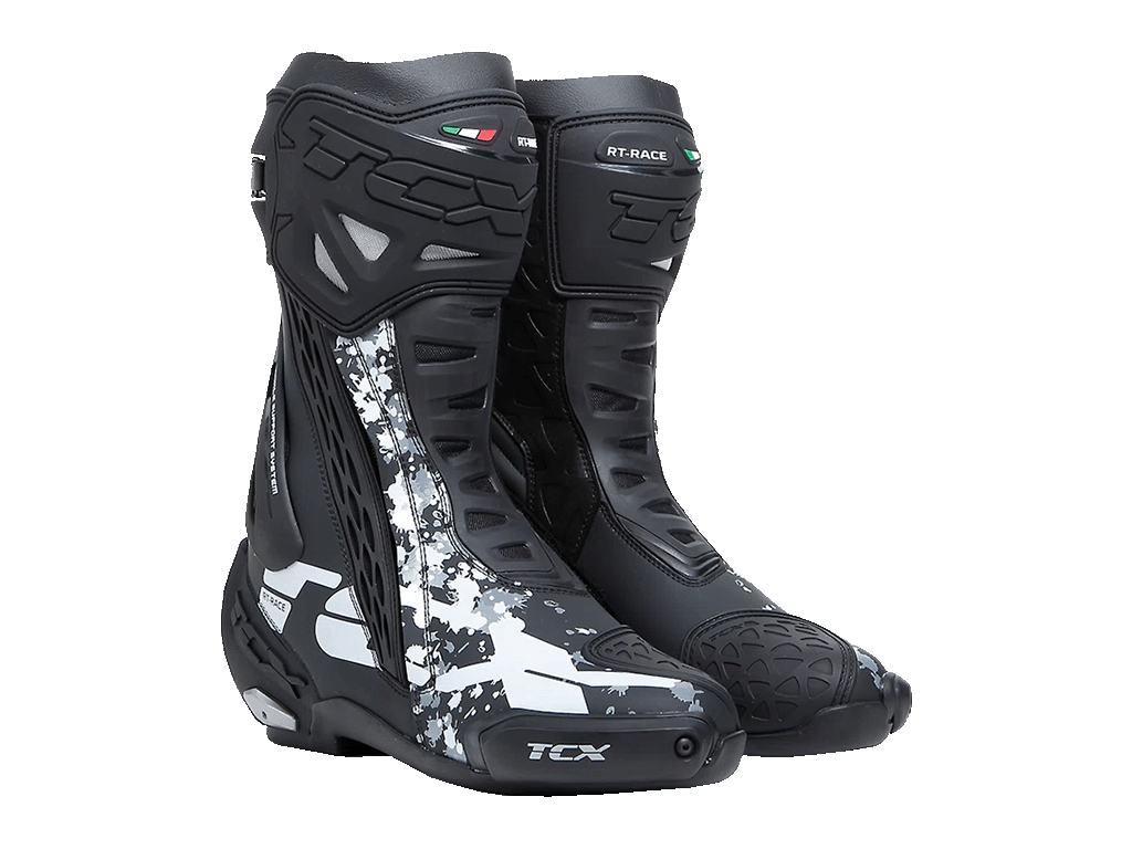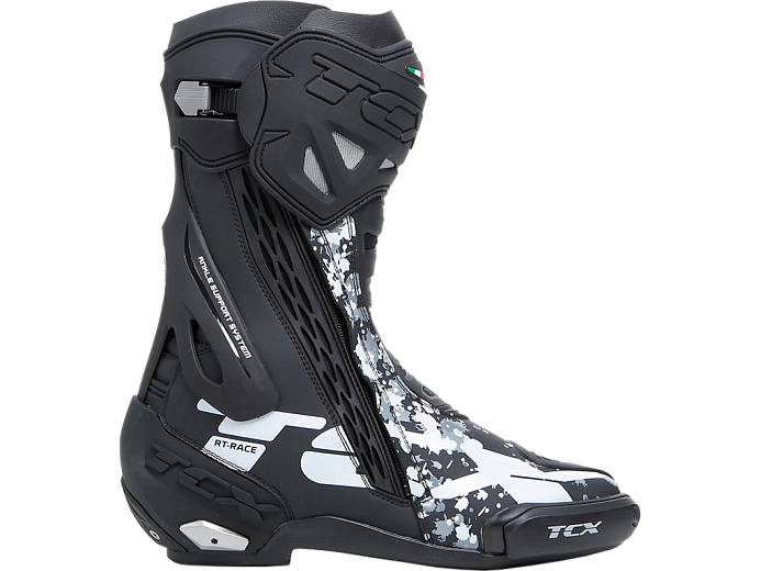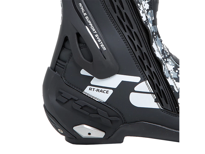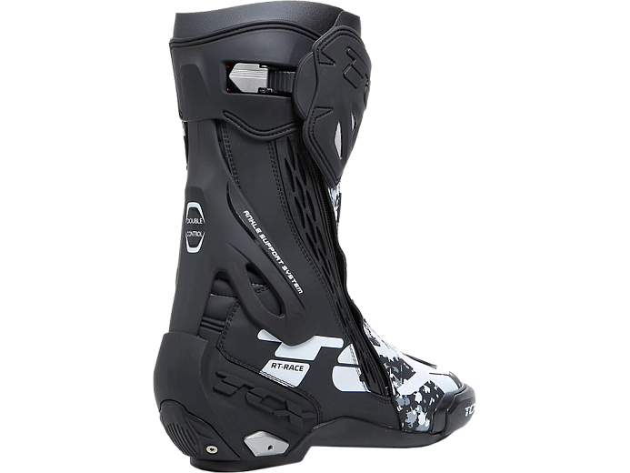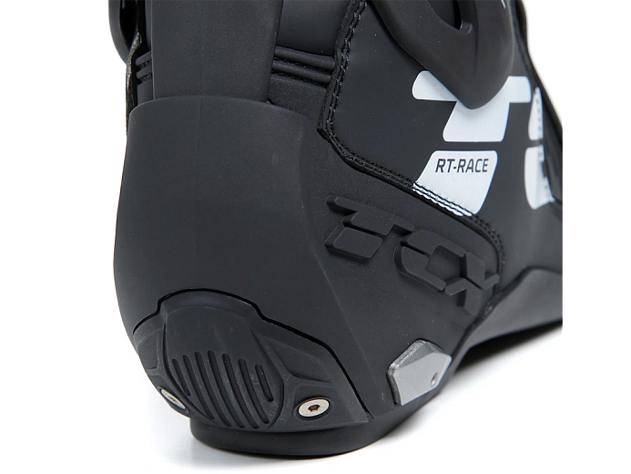 Мотоботинки RT-Race — это легкие спортивные ботинки, разработанные для максимальной безопасности и оптимального управления мотоциклом. RT-Race включает в себя Fasten Fit Control, внутреннюю систему шнуровки, соединенную с подкладкой ботинка с помощью быстроскользящих шнурков, благодаря чему верх может максимально охватывать ногу, а посадку можно персонализировать вплоть до миллиметра. Система крепления ботинка включает алюминиевую застежку с микрометрической регулировкой и быстросъемным механизмом, разработанным таким образом, чтобы голенище идеально адаптировалось к различным формам голени, а также на обуви есть боковая молнию с эластичной планкой. Модель TCX RT-Race оснащена системой предотвращения скручивания голеностопа Double Flex Control — полиуретановым шарниром в области лодыжки, способным контролировать движение до миллиметра, обеспечивая идеальную поддержку и гибкость суставов, предотвращая опасное скручивание и риск травм. Верх выполнен из износостойкой микрофибры. Внутренняя подкладка изготовлена из дышащей сетчатой ткани AIR TECH и имеет набивку разной толщины в области лодыжки для обеспечения максимального комфорта. На носке и пятке имеются сменные полиуретановые слайдеры, облегчающие скольжение при контакте с асфальтом. В наиболее уязвимых местах, таких как голень, лодыжка, носок и пятка, имеется дополнительное усилений.