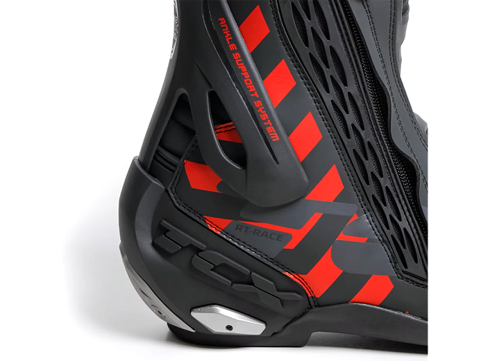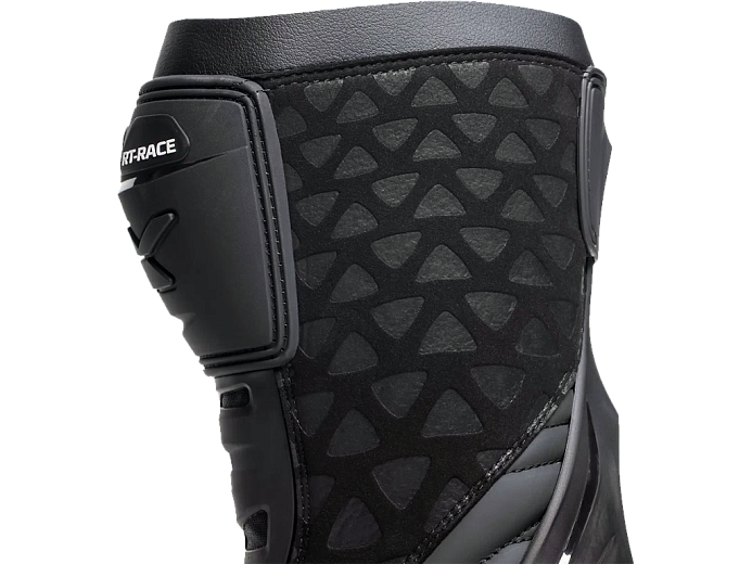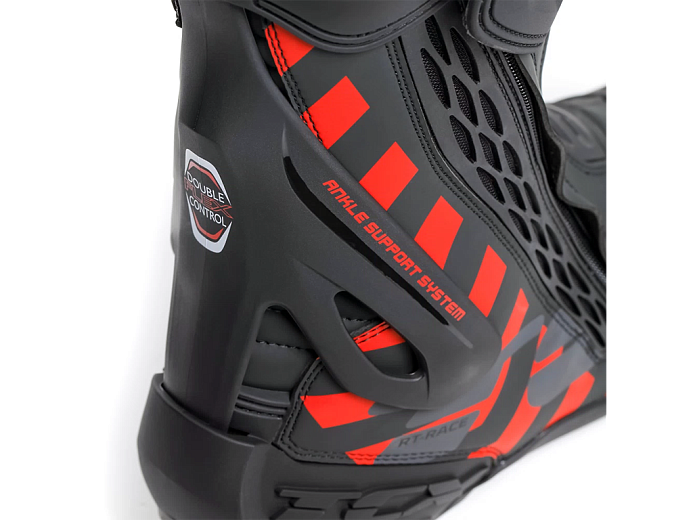 Мотоботинки RT-Race — это легкие спортивные ботинки, разработанные для максимальной безопасности и оптимального управления мотоциклом. RT-Race включает в себя Fasten Fit Control, внутреннюю систему шнуровки, соединенную с подкладкой ботинка с помощью быстроскользящих шнурков, благодаря чему верх может максимально охватывать ногу, а посадку можно персонализировать вплоть до миллиметра. Система крепления ботинка включает алюминиевую застежку с микрометрической регулировкой и быстросъемным механизмом, разработанным таким образом, чтобы голенище идеально адаптировалось к различным формам голени, а также на обуви есть боковая молнию с эластичной планкой. Модель TCX RT-Race оснащена системой предотвращения скручивания голеностопа Double Flex Control — полиуретановым шарниром в области лодыжки, способным контролировать движение до миллиметра, обеспечивая идеальную поддержку и гибкость суставов, предотвращая опасное скручивание и риск травм. Верх выполнен из износостойкой микрофибры. Внутренняя подкладка изготовлена из дышащей сетчатой ткани AIR TECH и имеет набивку разной толщины в области лодыжки для обеспечения максимального комфорта. На носке и пятке имеются сменные полиуретановые слайдеры, облегчающие скольжение при контакте с асфальтом. В наиболее уязвимых местах, таких как голень, лодыжка, носок и пятка, имеется дополнительное усилений.