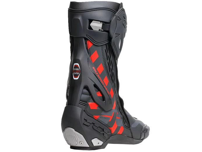 Система Double Flex Control [D.F.C.] — это уникальная конструкция голеностопного сустава, которая обеспечивает идеальный баланс между свободой движений и поддержкой суставов, предотвращая нежелательное сгибание и скручивание. Система D.F.C.выполнена из полиуретана, фиксируется с помощью двух скрытых боковых винтов на пяточном упоре на уровне лодыжки. Система имеет два язычка в задней части ботинка, которые вставляются в специальные карманы с предохранительными замками, что позволяет контролируемо сгибать ногу назад на 13 градусов и вперед на 14. Каркас системы из полиуретана изящно охватывает ногу, формируя плоскую внутреннюю поверхность, что обеспечивает хорошее сцепление с деталями мотоцикла и предотвращает его зацепление во время езды. Система D.F.C. спроектирована таким образом, чтобы обеспечить более высокий уровень защиты даже в случае аварии; пяточный упор был разработан для поглощения энергии удара и оснащен задними и боковыми слайдерами, способствующими естественному скольжению в случае падения.