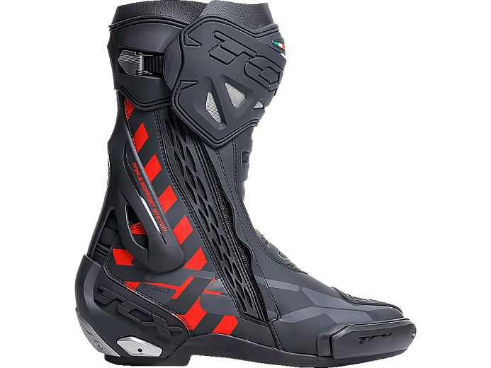 Мотоботинки RT-Race — это легкие спортивные ботинки, разработанные для максимальной безопасности и оптимального управления мотоциклом. RT-Race включает в себя Fasten Fit Control, внутреннюю систему шнуровки, соединенную с подкладкой ботинка с помощью быстроскользящих шнурков, благодаря чему верх может максимально охватывать ногу, а посадку можно персонализировать вплоть до миллиметра. Система крепления ботинка включает алюминиевую застежку с микрометрической регулировкой и быстросъемным механизмом, разработанным таким образом, чтобы голенище идеально адаптировалось к различным формам голени, а также на обуви есть боковая молнию с эластичной планкой. Модель TCX RT-Race оснащена системой предотвращения скручивания голеностопа Double Flex Control — полиуретановым шарниром в области лодыжки, способным контролировать движение до миллиметра, обеспечивая идеальную поддержку и гибкость суставов, предотвращая опасное скручивание и риск травм. Верх выполнен из износостойкой микрофибры. Внутренняя подкладка изготовлена из дышащей сетчатой ткани AIR TECH и имеет набивку разной толщины в области лодыжки для обеспечения максимального комфорта. На носке и пятке имеются сменные полиуретановые слайдеры, облегчающие скольжение при контакте с асфальтом. В наиболее уязвимых местах, таких как голень, лодыжка, носок и пятка, имеется дополнительное усилений.
