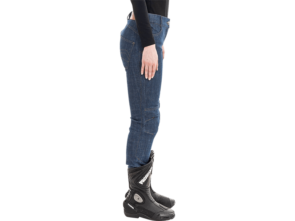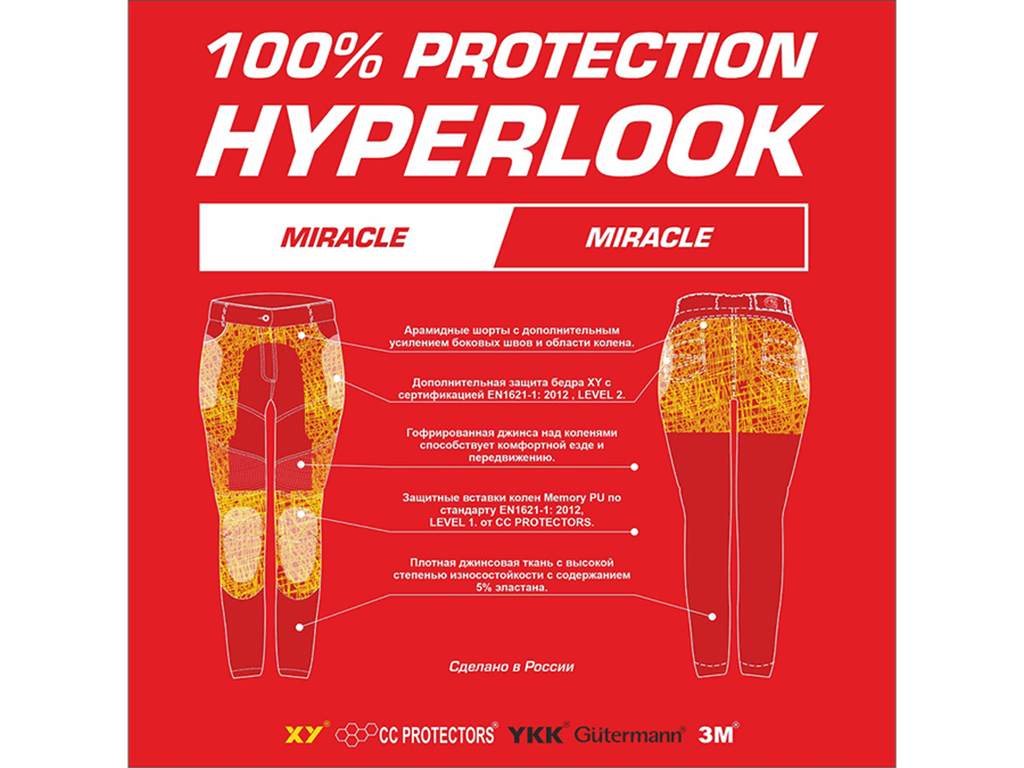 Мотоджинсы Hyperlook Miracle c арамидом и защитными вставками Memory PU в области колен CC PROTECTORS и дополнительными вставки в области бедер, точно не оставят девушек равнодушными. Джинсы Miracle придадут Вашей фигуре красоту и изящество, они превосходно сидят, что несомненно важно для девушек. А гофрированная джинса над коленями способствует комфортной езде и посадке. Арамидная ткань полностью покрывает тазовый отдел , как с передней так и с задней стороны , дополнительно арамидная ткань присутствует в области колен. Женские мотоджинсы с защитой Hyperlook Miracle отличная альтернатива классическим джинсам, которые не имеют защиты и не сохранят Ваше здоровье при падении. Защитные вставки из области таза и колен, можно вынуть в любой момент без особых усилий.