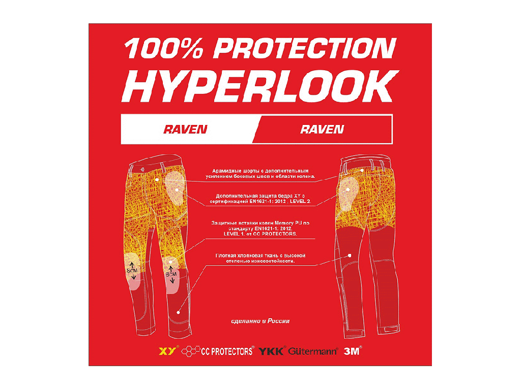 Мотоджинсы Hyperlook Raven изготовлены из плотной и приятной джинсы турецкой фирмы Sevgili. Внутренние усиление из арамидной ткани выполнено в классическом стиле Hyperlook, арамидные шорты, усиление бокового шва арамидной лентой, а так же усиление арамидом в районе колен. Брюки комплектуются сертифицированной защитой колен и бедер. Джинсы Raven обладают идеальной посадкой, благодаря выточкам и конструкторским инновациям, которые были использованы при разработке джинс. Гармоничный дизайн, высокий пояс защищающий спину от продувания, глубокие боковые карманы, высококачественная фурнитура соответствуют самым высоким запросам потребителя.