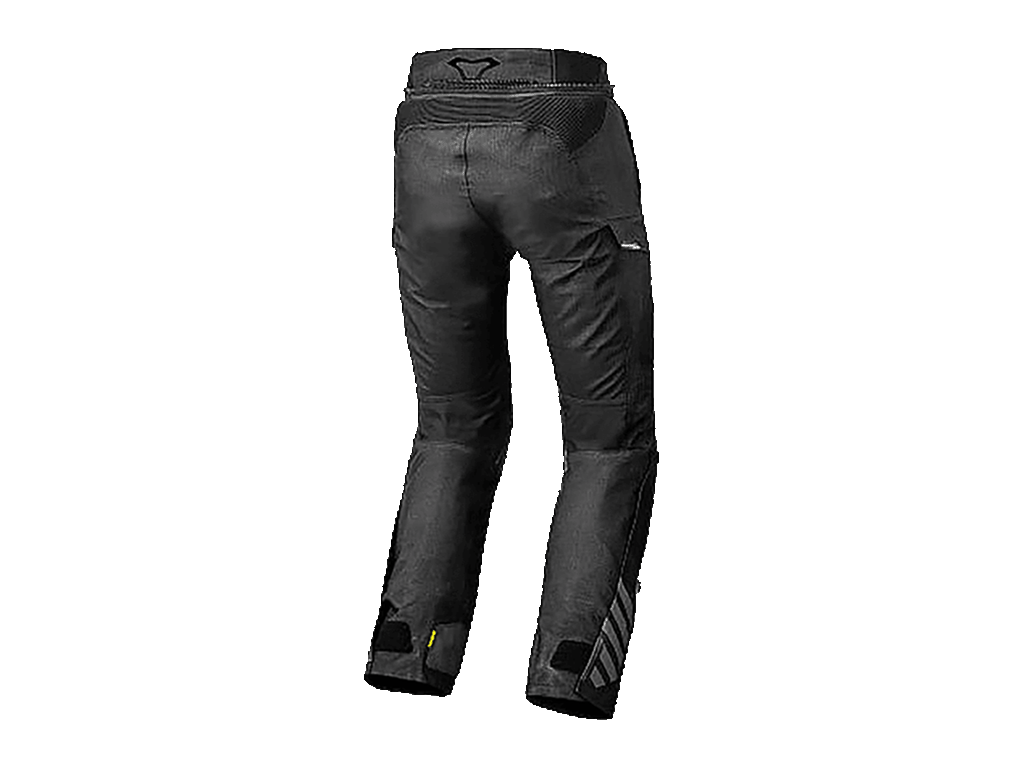 Чтобы вентиляция не мешала защите от воды, воздухозаборники закрыты непромокаемыми молниями. Выпускающий их бренд Гетблок гарантирует водонепроницаемость при условии правильного использования и обслуживания. Нижняя часть штанин усилена вставкой Heat Shield (тепловая защита). Она защищает брюки и ноги от повреждений при контакте с раскалённым глушителем. Для дополнительного комфорта и свободы движений над коленями расположены стретч-вставки, работающие по принципу гармошки. Они сделаны изустойчивого к трению материала с арамидными волокнами. На поясе сзади - две молнии разных стандартов для стыковки с курткой. Есть проушины для подтяжек.