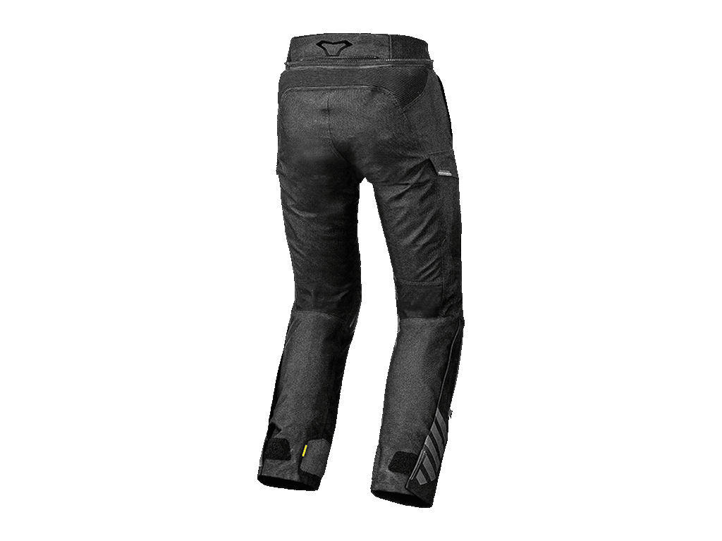 Чтобы вентиляция не мешала защите от воды, воздухозаборники закрыты непромокаемыми молниями. Выпускающий их бренд Гетблок гарантирует водонепроницаемость при условии правильного использования и обслуживания. Нижняя часть штанин усилена вставкой Heat Shield (тепловая защита). Она защищает брюки и ноги от повреждений при контакте с раскалённым глушителем. Для дополнительного комфорта и свободы движений над коленями расположены стретч-вставки, работающие по принципу гармошки. Они сделаны изустойчивого к трению материала с арамидными волокнами. На поясе сзади - две молнии разных стандартов для стыковки с курткой. Есть проушины для подтяжек.