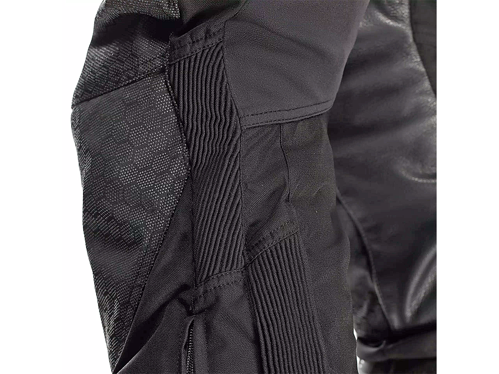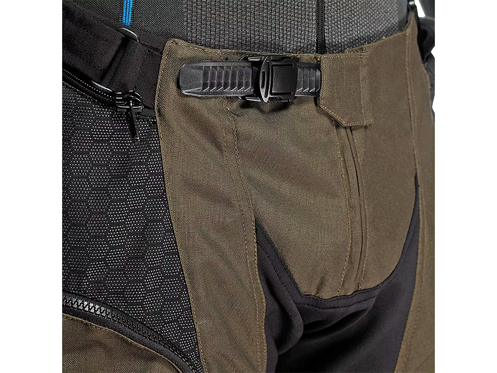 Мотобрюки рассчитаны на езду как сидя, так и во внедорожной стойке. Чтобы держать коленями мотоцикл, изнутри на них нашиты кожаные накладки. Брюки можно носить поверх мотобот, либо заправлять внутрь. Брюки обеспечивают серьезный уровень безопасности. На коленях установлены композитные щитки, сертифицированные по стандарту EN 1621.1 Level 2. На бедрах - накладки Level 1.
