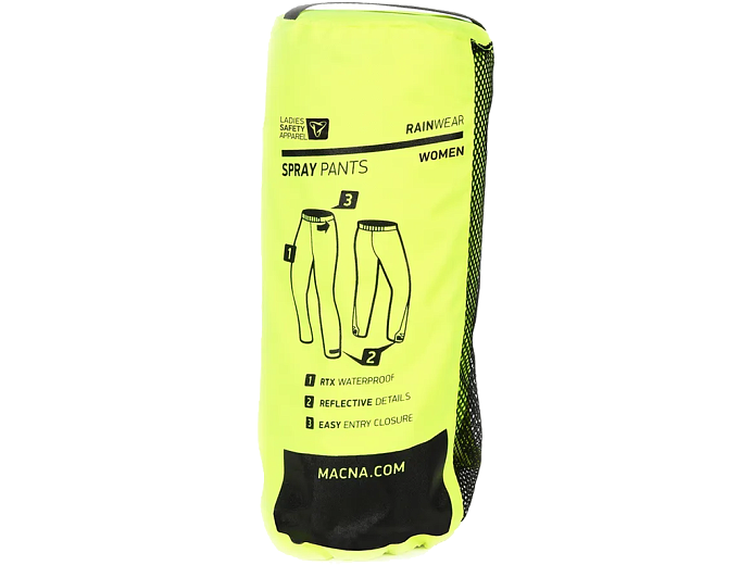 Macna Spray - женский мотодождевик традиционной конструкции. Защищает от дождя, в том числе продолжительного. В дождевике для мотоцикла можно ехать целый день и оставаться сухим. Брюки сделаны с учётом женского телосложения, надеваются поверх мотоэкипировки либо повседневной одежды. Крой свободный, можно быстро одеться, когда пошёл дождь, не снимая обуви. Материал - водонепроницаемый полиэстер. Обхват регулируется на штанинах и на поясе.