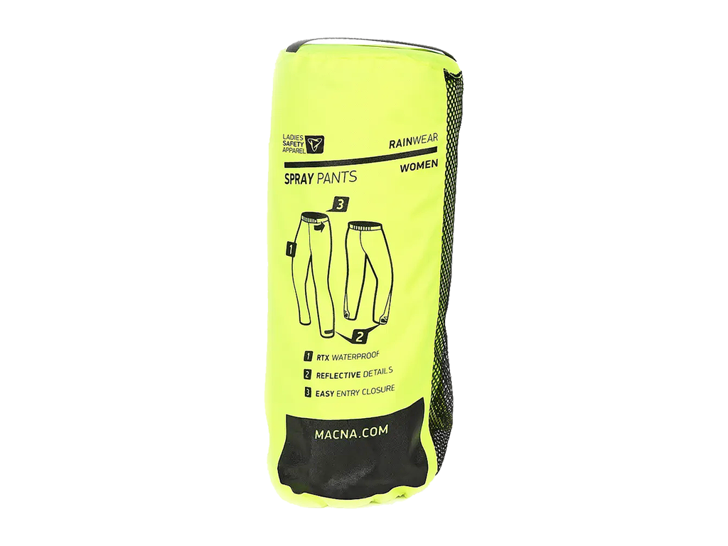 Macna Spray - женский мотодождевик традиционной конструкции. Защищает от дождя, в том числе продолжительного. В дождевике для мотоцикла можно ехать целый день и оставаться сухим. Брюки сделаны с учётом женского телосложения, надеваются поверх мотоэкипировки либо повседневной одежды. Крой свободный, можно быстро одеться, когда пошёл дождь, не снимая обуви. Материал - водонепроницаемый полиэстер. Обхват регулируется на штанинах и на поясе.