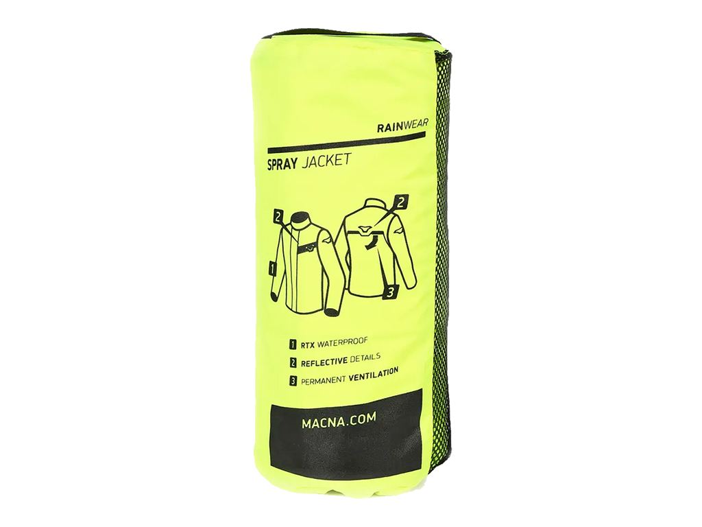 Macna Spray - мотодождевик традиционной конструкции. Защищает от дождя, в том числе продолжительного. В дождевике для мотоцикла можно ехать целый день и оставаться сухим. Куртка надевается поверх мотоэкипировки либо повседневной одежды. Она сделана из водонепроницаемого полиэстера. Чтобы дождевик не раздувался, как парашют, в задней части есть защищенные от попадания воды выпускные клапаны. Также они выполняют функцию вентиляционных отверстий. Обхват рукавов регулируется “липучками”.