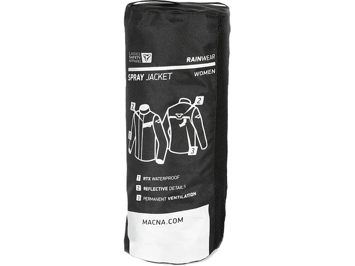 Macna Spray - женский мотодождевик традиционной конструкции. Защищает от дождя, в том числе продолжительного. В дождевике для мотоцикла можно ехать целый день и оставаться сухим. Куртка легко надевается поверх мотоэкипировки либо повседневной одежды. Она сделана из водонепроницаемого полиэстера с учетом особенностей женского телосложения. Чтобы дождевик не раздувался, как парашют, в задней части есть защищенные от попадания воды выпускные клапаны. Также они выполняют функцию вентиляционных отверстий. Обхват рукавов регулируется “липучками”.