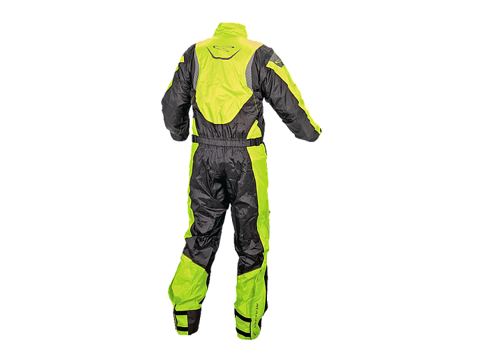 Дождевик сделан из ткани с мембраной Raintex. Она не просто водонепроницаемая, но и дышащая. Поэтому вероятность вспотеть в тёплую погоду или при интенсивной физической нагрузке меньше, чем в обычных плёночных моделях. На левом бедре расположен водонепроницаемый карман. В дождливую погоду видимость значительно ухудшается, особенно ночью. Чтобы мотоциклист был более заметным в свете фар, на комбинезоне со всех сторон расположены ламинированные светоотражающие элементы. При хранении и перевозке дождевик компактно складывается в небольшой мешочек с сетчатыми элементами. Через них вода стекает и испаряется, а дождевик сохнет даже упакованном состоянии.