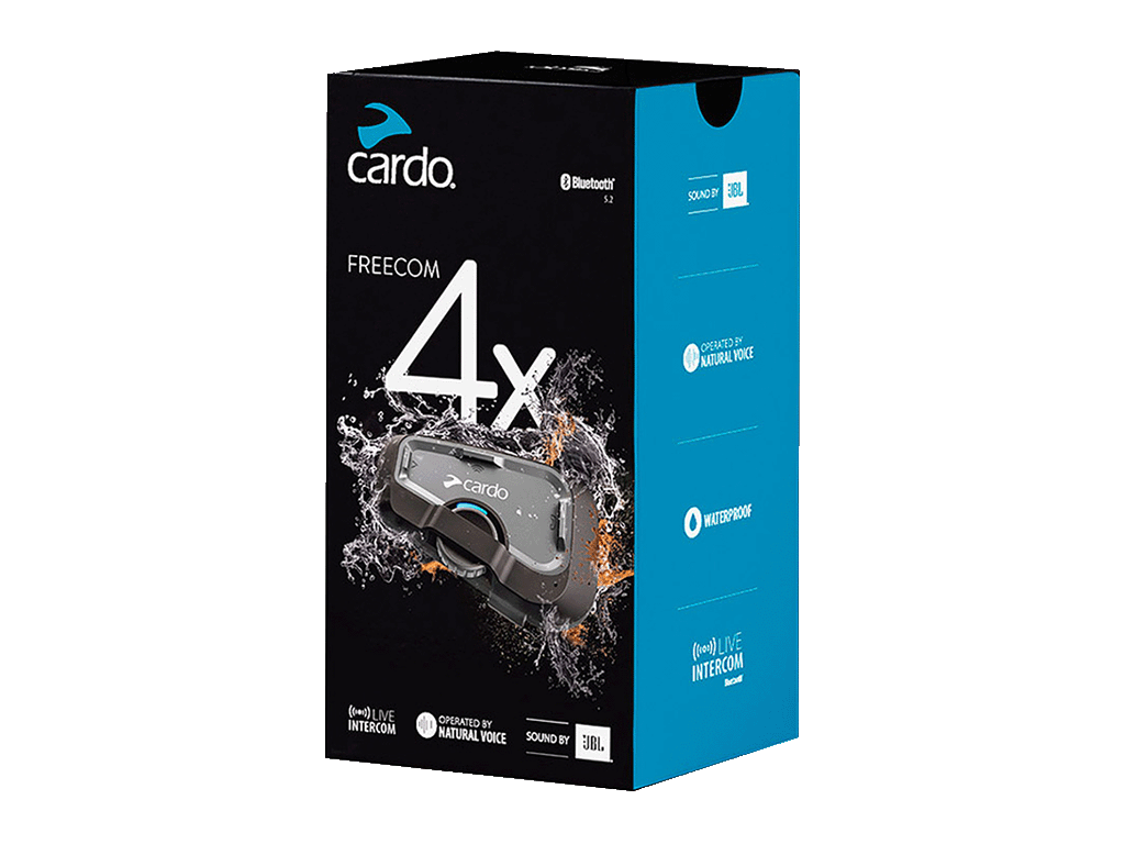 Cardo Freecom 4x – полнофункциональный Bluetooth-коммуникатор. При использовании одинаковых устройств позволяет общаться в группе до четырех человек. Оснащен широкополосным звуком от JBL, голосовым управлением и автоматическим переподключением Bluetooth-соединения Live Intercom.