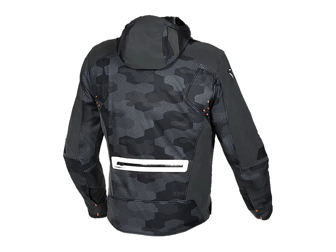 Модель мотокуртки Angle оснащена большим количеством карманов. Капюшон можно отстегнуть или закрепить на спине во избежание раздувания во время движения.