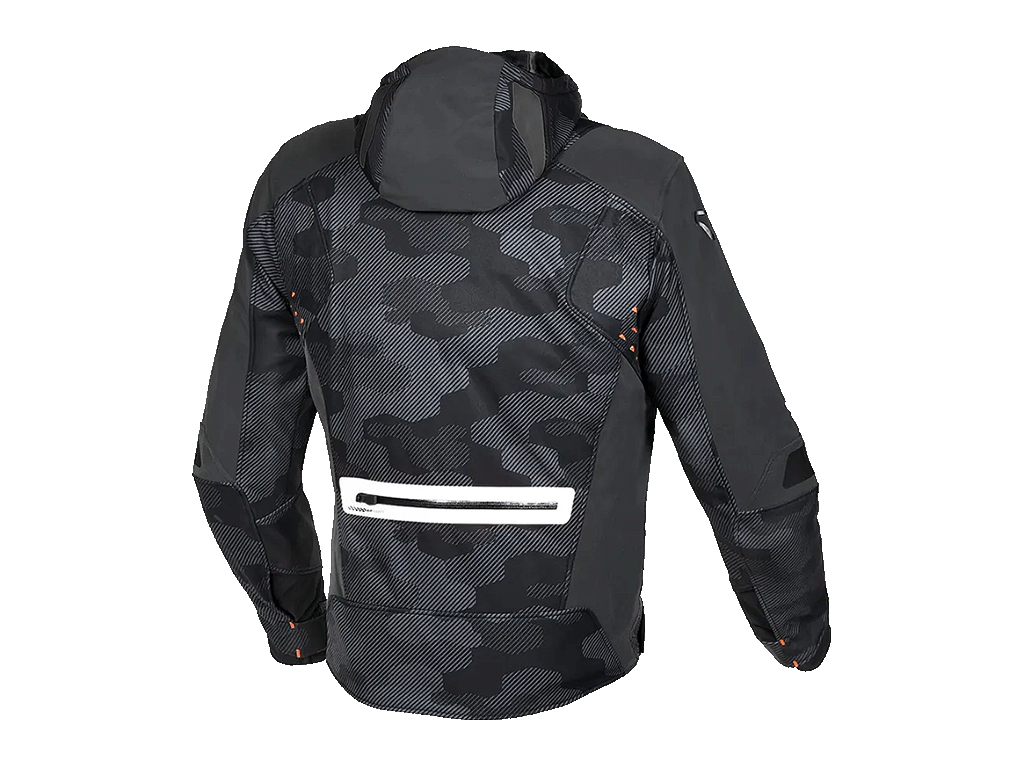 Модель мотокуртки Angle оснащена большим количеством карманов. Капюшон можно отстегнуть или закрепить на спине во избежание раздувания во время движения.