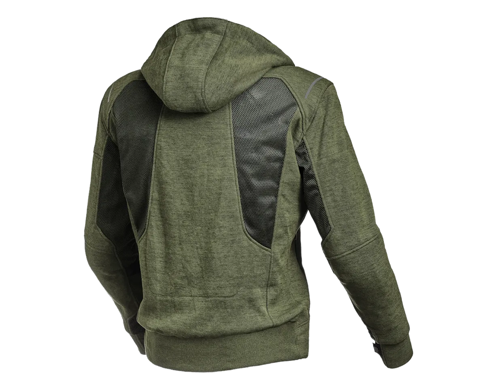 Чтобы капюшон не парусил на скорости, он фиксируется на спине. Если мешается и в таком виде, его можно отстегнуть. Куртка не только удобная, но и безопасная. На локтях и плечах установлены встроенные щитки RISC, сертифицированные по стандарту безопасности CE уровня 1. На спине и груди - карманы для жёсткой защиты (приобретается отдельно).