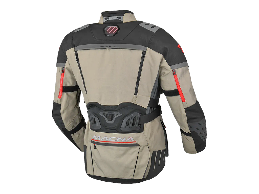 Куртка Macna Chieftane состоит из трёх слоёв, основного, утепляющего и мембранного водонепроницаемого. Базовый - из прочной ткани Ripstop 2 мм. Этот материал с характерной квадратной текстурой устойчив к повреждениям. В нём комфортно ездить в жаркую и тёплую погоду. На груди, спине и рукавах расположены вентиляционные карманы. В холод их можно закрыть. Слои можно комбинировать в соответствии с погодой. Снятые - убирать в большой карман на пояснице.