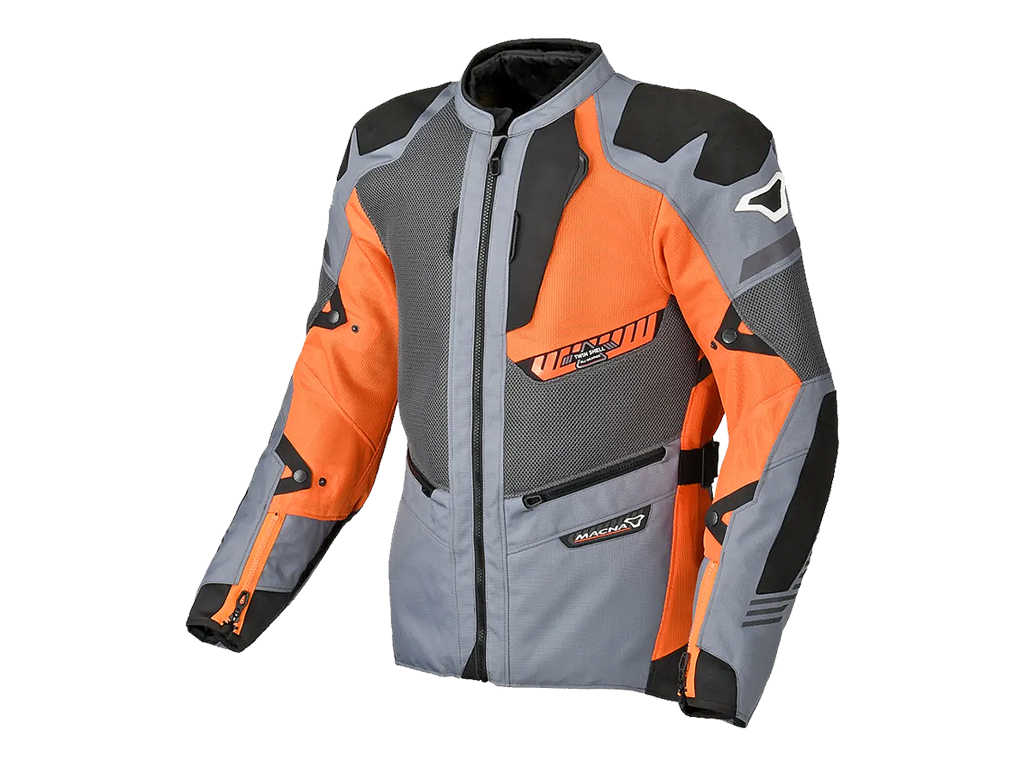 Куртка Macna Synchrone состоит из трёх слоёв. Каждый можно носить отдельно. Основной - из сетчатой ткани. В нём комфортно ездить в жаркую и тёплую погоду. На куртке расположены сетчатые панели Air Burst большой площади. Трехмерная структура не просто хорошо пропускает воздух. но и создаёт между курткой и телом дышащую прослойку. При этом сетка обладает высокой устойчивостью к абразивному воздействию и выдерживают скольжение по асфальту.
