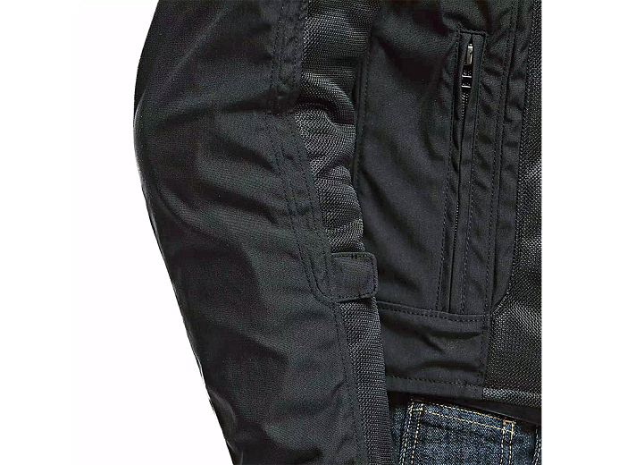 Локти и плечи закрывают композитные щитки EN 17092 класса A. Сзади - карман для защиты спины G1 и G2, спереди - для защиты груди (приобретаются отдельно). При высоком уровне безопасности, такая конфигурация не мешает двигаться и получать удовольствие от езды. Обхват не шее, поясе и запястьях регулируется.