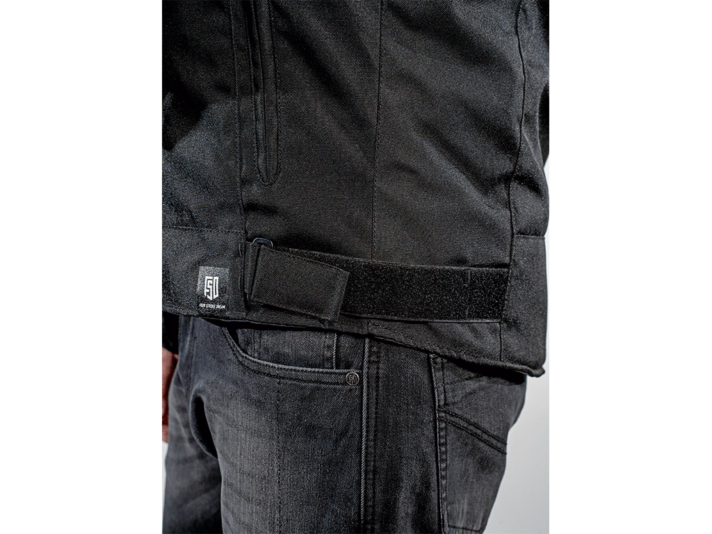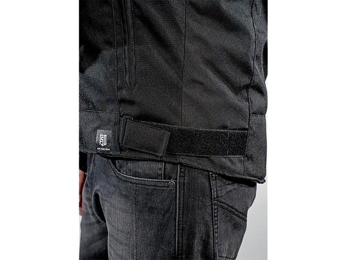 Куртка не сковывает движения и точно усаживается по фигуре благодаря эластичным вставкам на локтях и на спине. Они прошиты по принципу гармошки и легко тянутся. Куртка регулируется ремнями на поясе, шее, предплечье и бицепсе.