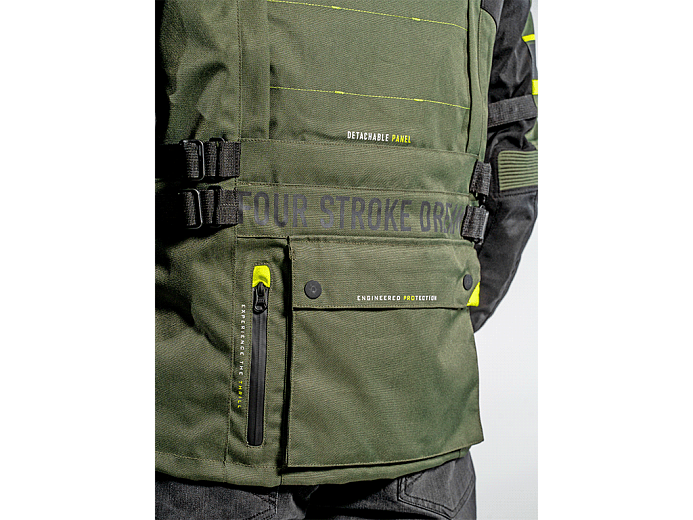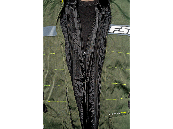 В холод изнутри крепится теплая подкладка. Она надежно держится на молнии, не сползает и не задирается. На случай дождя - еще одна подкладка, непромокаемая. В полностью собранной трехслойной конфигурации куртка выдерживает самую суровую непогоду. Чтобы между мотокурткой и брюками не задувал холодный воздух, а также для безопасности в задней части нашита стыковочная молния. Она совместима с брюками FSD и некоторых других производителей. Если на ваших штанах нет аналогичной молнии, к ним можно пришить ответную часть (поставляется с курткой).