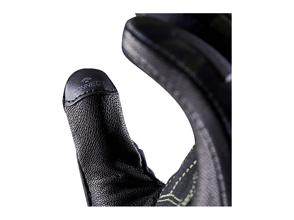 Материал наладонной части - козья кожа высшего качества. Она обеспечивает плотный хват и точное чувство руля. При этом она достаточно прочная, чтобы выдерживать скольжение по асфальту. Для дополнительной защиты на ладони расположен слайдер Ergo Protech из полумягкого материала. поверхность на кончиках указательных и больших пальцев позволяет пользоваться сенсорными экранами смартфонов, навигаторов и других девайсов прямо в перчатках.