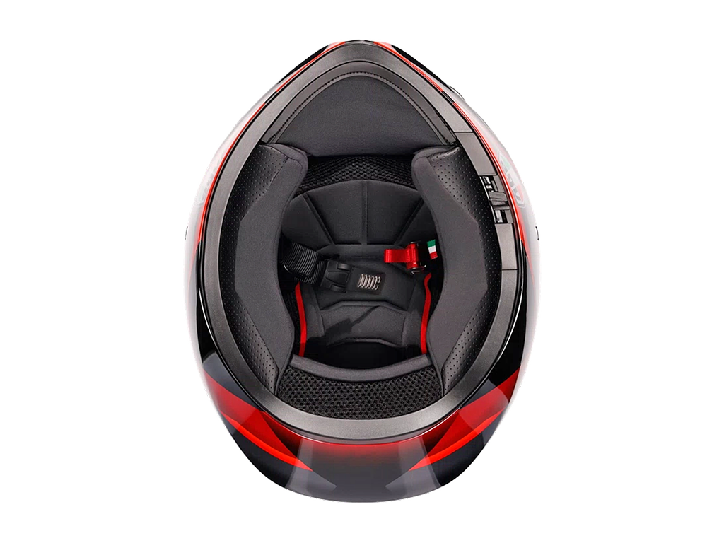 Шлем не слишком тяжелый сам по себе. Но, благодаря аэродинамике, на ходу ощущается еще более легким. На скорости 130 километров в час его динамический вес равен нулю. Давление на голову и шею минимальное, концентрация на дороге - максимальная. Подкалка сделана из материала 2DRY. Она быстро абсорбирует пот, может быть персонализирована под форму головы. Воздухозаборники расположены в районе подбородка и лба, легко открываются и закрываются руками в перчатках. Микропряжка на ремне легко закрывается и настраивается.