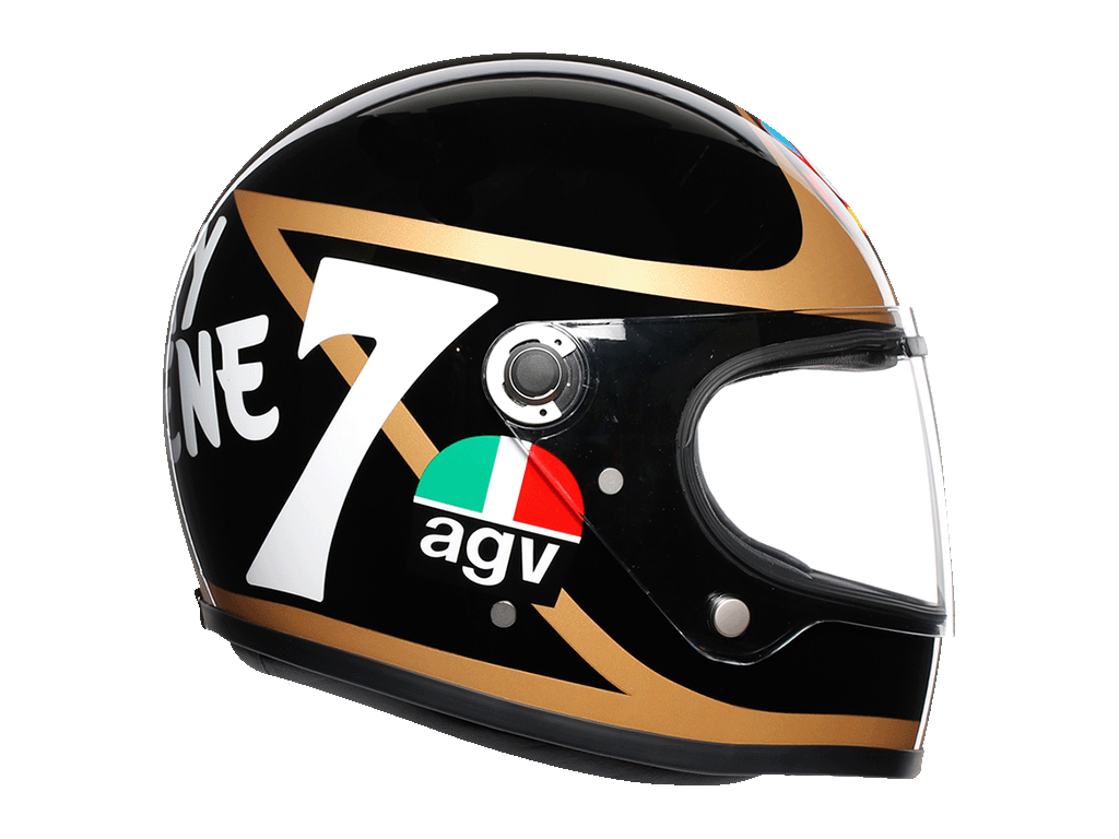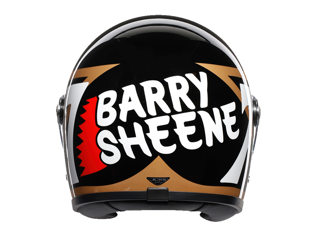 Спортивный шлем в ретро стиле, одна из расцветок шлема выполнена в память о легендарном, британском гонщике Барри Шине.