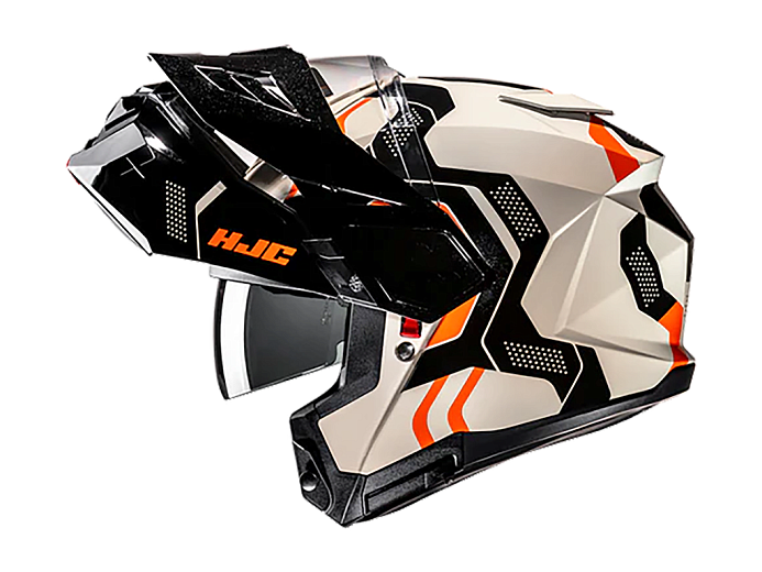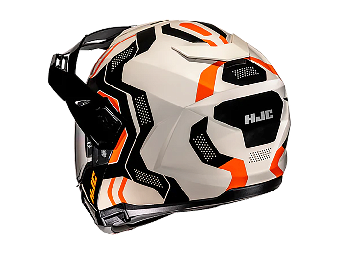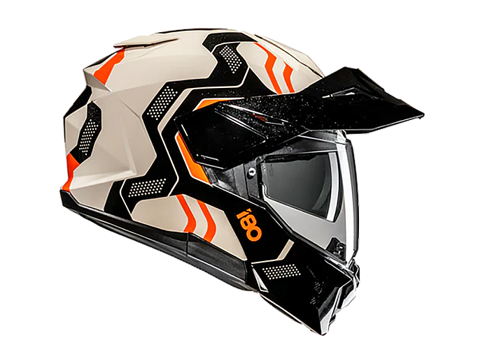 HJC i80 - мотошлем для туристических эндуро. Совмещает удобство и безопасность модуляра с кроссовым стилем. Подбородочная дуга вместе с визором поднимается наверх и фиксируется. Это полезно при коротких остановках, когда нужно открыть лицо, но не хочется снимать шлем. Чтобы не перегреваться на низких скоростях в жаркую погоду, с поднятой “челюстью” можно ездить, как в открытом шлеме. Она фиксируется в верхнем положении переключателем и не закрывается от тряски.