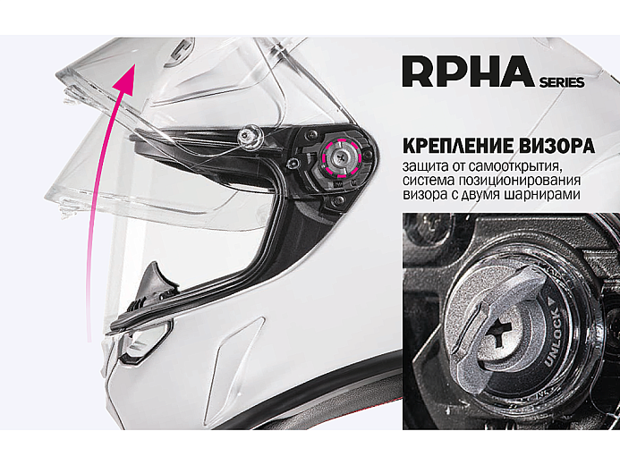 Простая и надежная система крепления визора дает возможность быстро менять стекло, например во время пит-стопов в многочасовых гонках Endurance. В RPHA 1 используется визор HJ-35, совместимый с пинлоками и отрывными пленками (поставляются в комплекте со шлемом). Запасные прозрачные и тонированные в разные цвета визоры, а таже пинлоки заказывайте здесь.