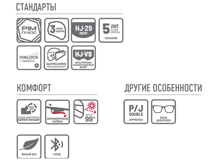 • HJ-29 — стандартный визор, HJ-29 RST — зеркальный визор, HJ-V9 солнцезащитный визор