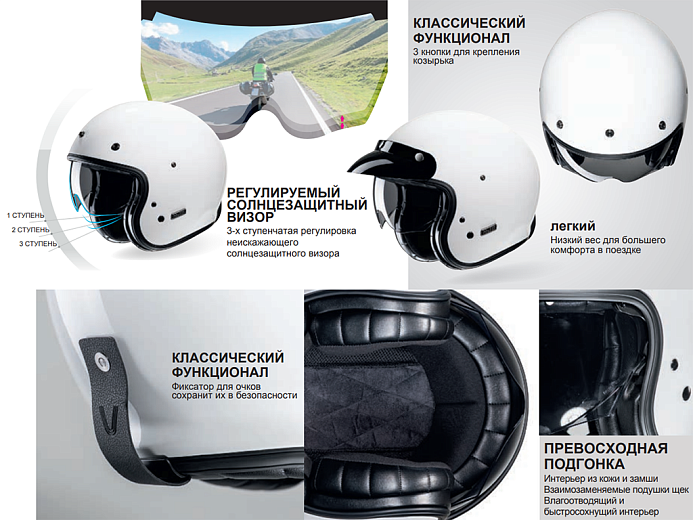 HJC V30 – открытый шлем в винтажном стиле, выполненный по самым современным технологиям. В шлем встроен солнцезащитным визором.