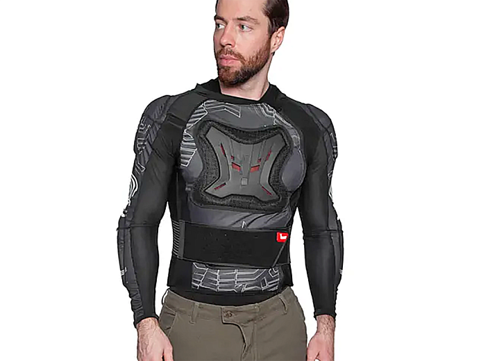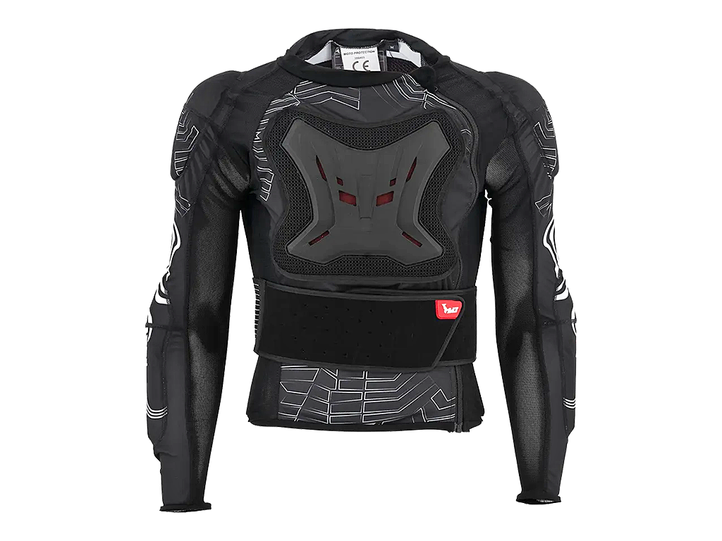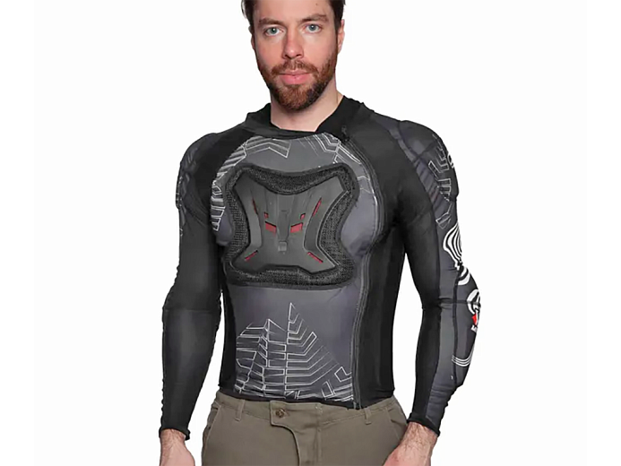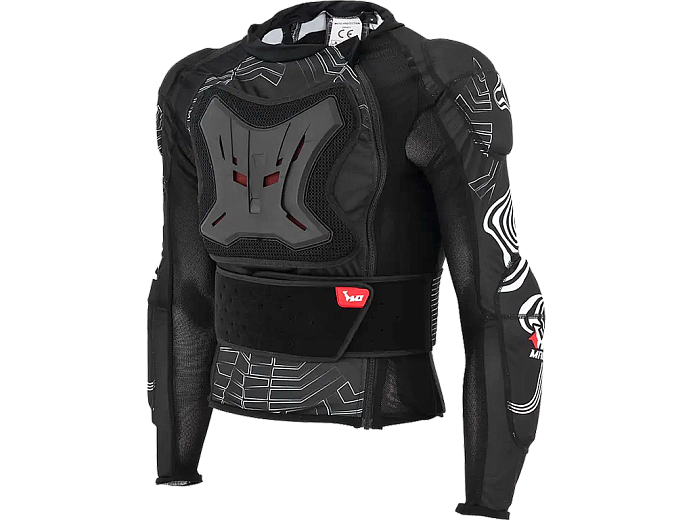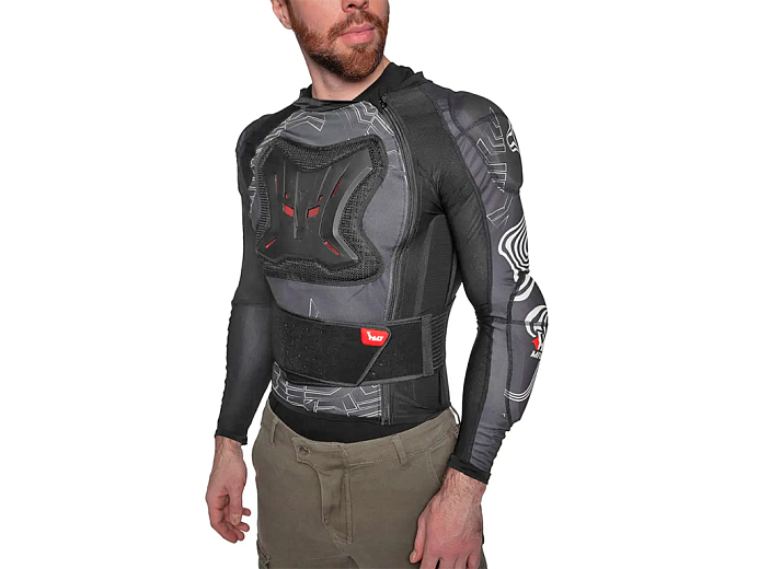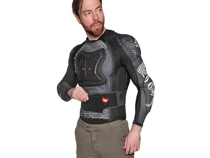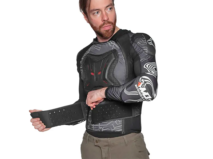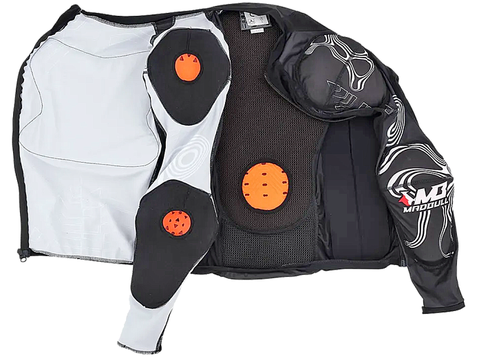 - Сетка располагается с внутренней стороны рук и по бокам туловища. Сзади по копчику и по бокам сетки также есть мягкие вставки из высокопрочного полимерного материала EVA, которые защищают корпус туловища при боковом падении.