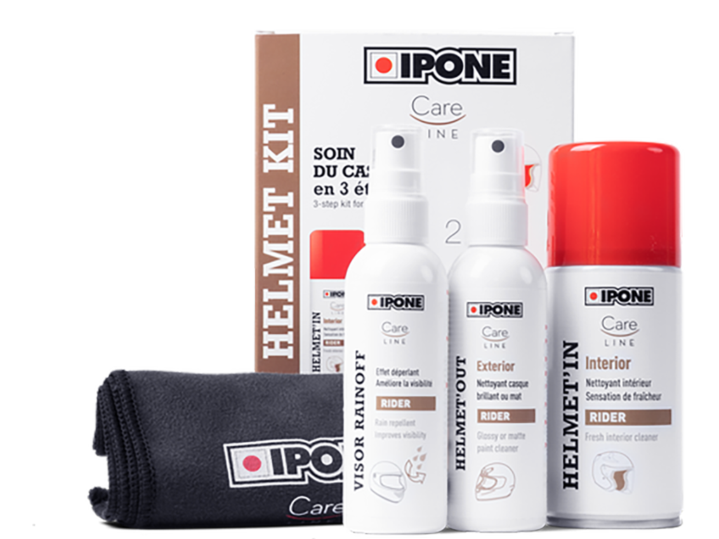 Для полного ухода за мотошлем приходится покупать несколько средств. Ipone избавляет вас от лишних трудностей. Все необходимое входит в набор Ipone Helmet Kit. Компоненты хранятся в удобной упаковке, всегда находятся под рукой, не теряются по шкафам и ящикам. В комплект входят: