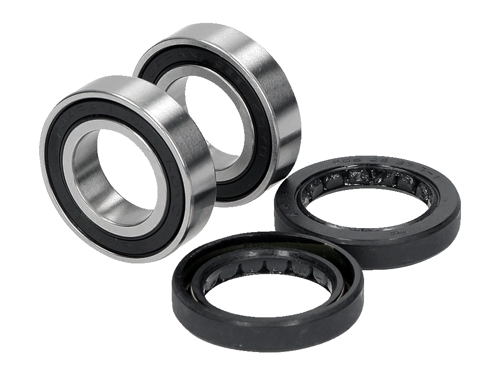 Комплект подшипников в колесо мотоцикла. Комплект включает в себя в случае применимости на переднее колесо: два подшипника и пыльники, если они предусмотрены конструкцией мотоцикла; в случае применимости на заднее колесо: два или три подшипника (третий подшипник для установки в крепление задней звезды) и пыльники.