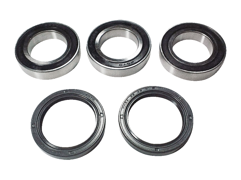 Комплект подшипников в колесо мотоцикла. Комплект включает в себя в случае применимости на переднее колесо: два подшипника и пыльники, если они предусмотрены конструкцией мотоцикла; в случае применимости на заднее колесо: два или три подшипника (третий подшипник для установки в крепление задней звезды) и пыльники.