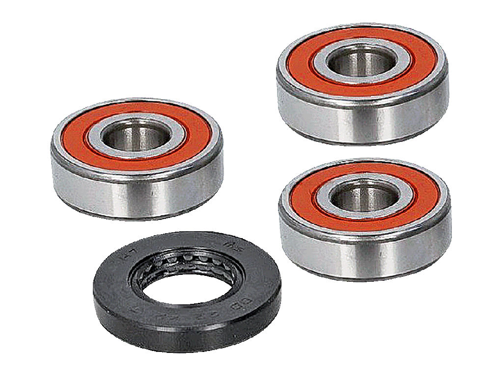 Комплект подшипников в колесо мотоцикла. Комплект включает в себя в случае применимости на переднее колесо: два подшипника и пыльники, если они предусмотрены конструкцией мотоцикла; в случае применимости на заднее колесо: два или три подшипника (третий подшипник для установки в крепление задней звезды) и пыльники.