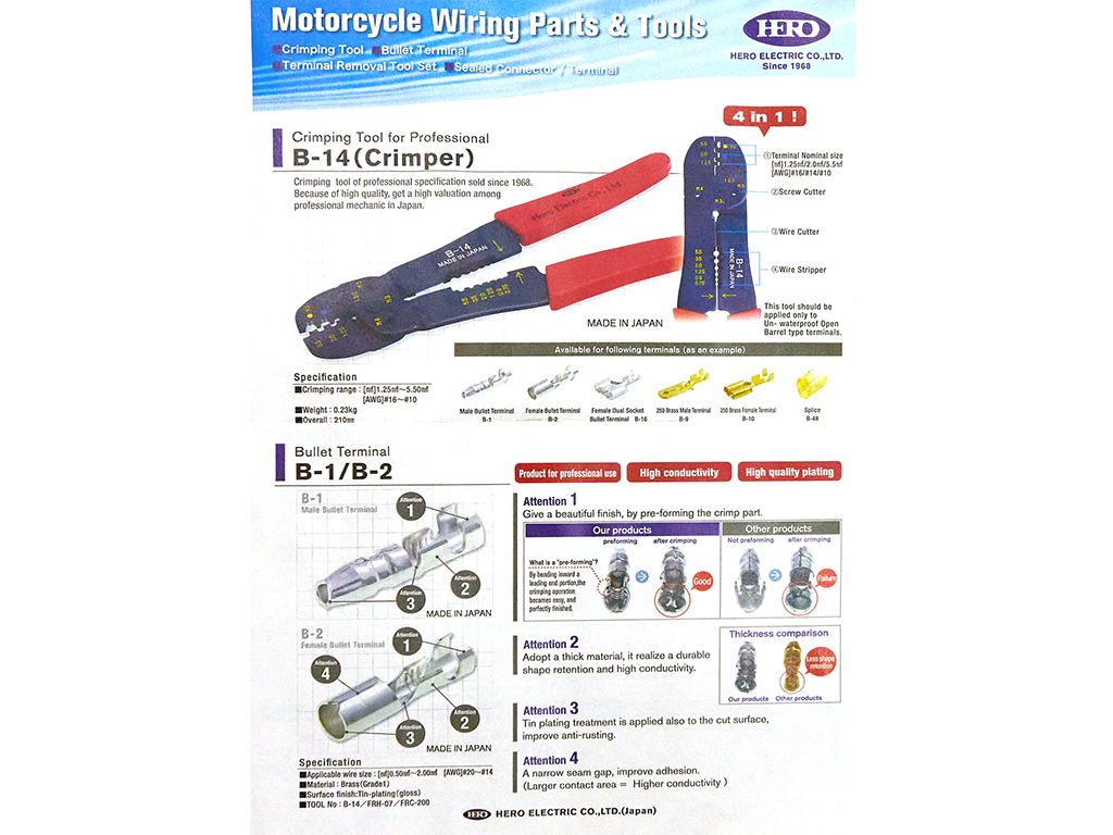В продаже в «Мистер Мото» волшебный чемоданчик «Мечта электрика». В набор Tourmax ETK-02BR Electrical Terminal Kit входят распространённые разъёмы для проводки, а также изолирующие насадки. Чтобы их обжимать и обрезать, в комплект входит профессиональный инструмент Terminal Crimper B-14. Он способен работать с разъёмами и проводами разного размера.