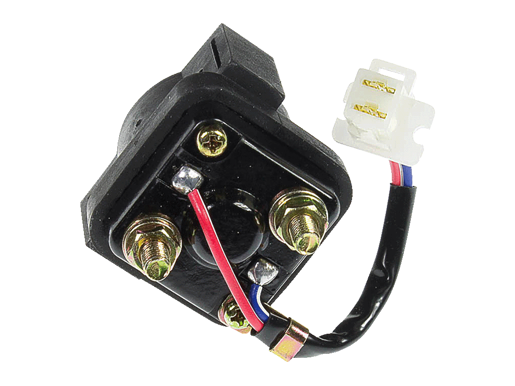 При срабатывании реле подает напряжение с аккумулятора на пусковой двигатель электростартера и происходит запуск двигателя. Так же на этом реле находятся предохранители, предотвращающие повреждения электростартера при неисправностях электроцепи мотоцикла, таких как короткое замыкание.